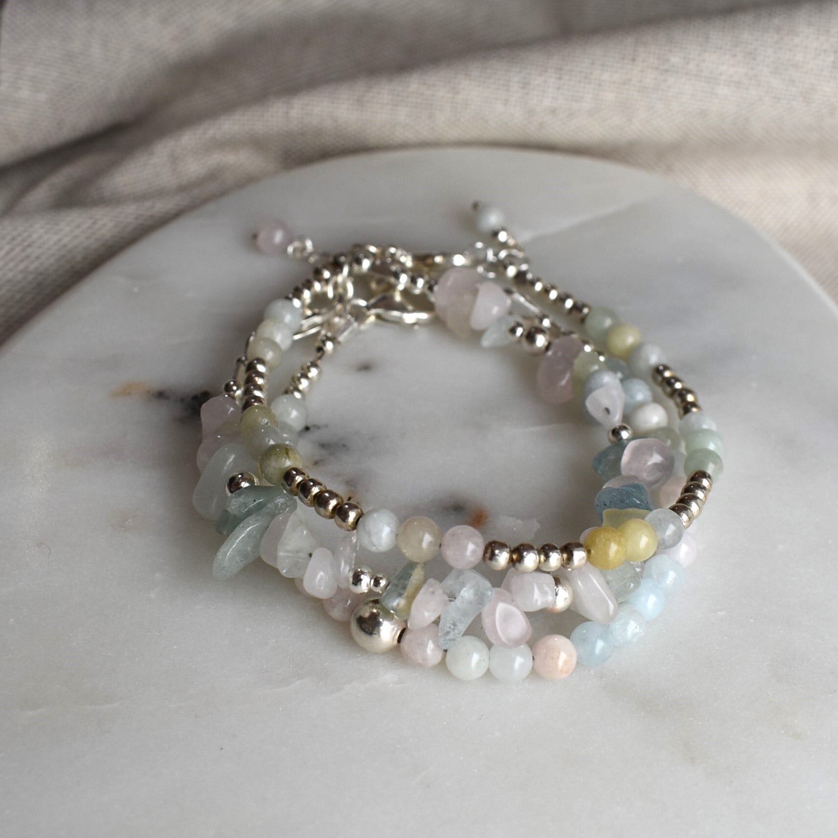 Deze prachtige edelsteen armband is gemaakt van edelstenen in mooi pastelkleurige morganiet in combinatie met zilveren kralen. De mooie pastelkleurige armband past ook uitstekend bij een zomerse jurk of naar een bruiloft in een summer chique look.
