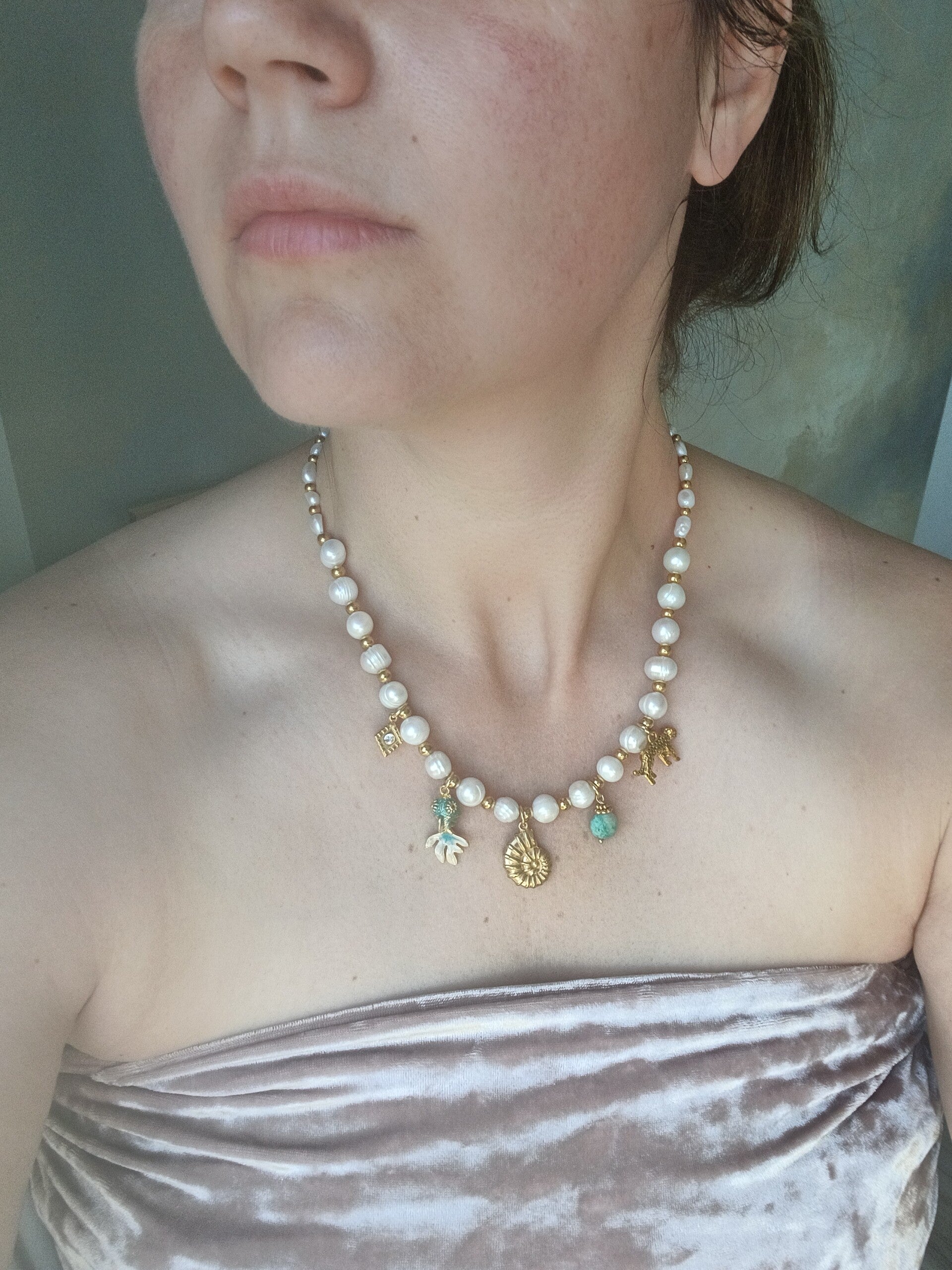 Shop nu deze betoverende parelketting met grote bedels, echte zoetwater parels en edelsteentjes. Deze ketting bedels is stijlvol en sierlijk door de combinatie met stainless steel gouden bedels en zoetwater parels. De blauwe edelsteen amazoniet die verwerkt is in deze parelketting geeft een extra sprankeling.