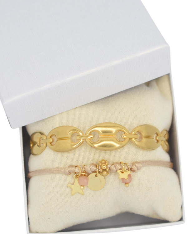 Aan het satijnen armbandje hangt een prachtige perzik kleurige maansteen. De vrouwelijke edelsteen maansteen gecombineerd met kleine bedels, maken deze armband tot favoriet!