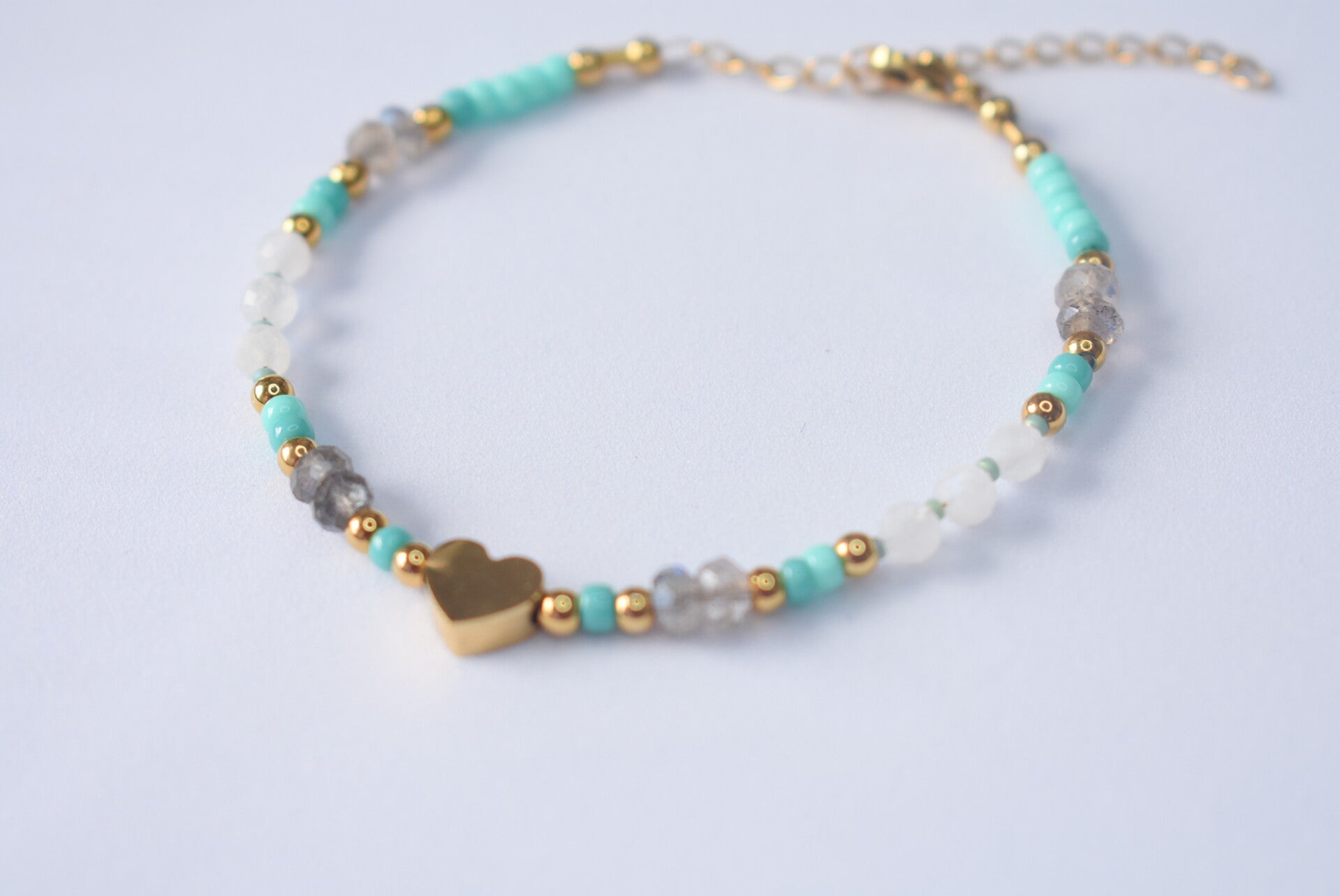 De labradoriet maakt van deze armband niet alleen een stijlvol accessoire, maar ook een betekenisvol sieraad. De speelse glaskraaltjes vangen het licht en zorgen voor een sprankelend effect dat bij elke beweging tot leven komt.