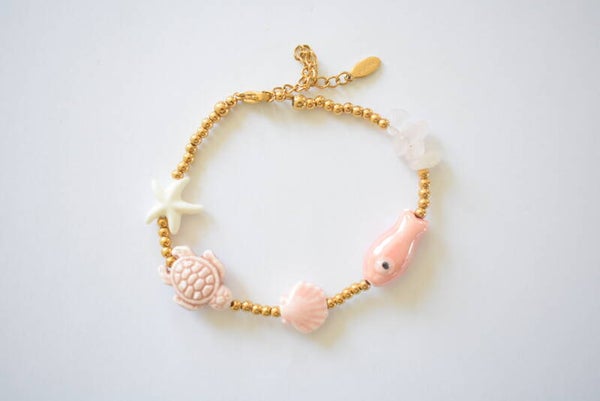 Shop nu deze stijlvolle gouden armband met zeebedels. Deze armband geeft jouw beach-look een sprankelende touch. De gouden stainless steel kralen, rozenkwarts stenen en de keramiek bedels, maken deze armband betoverend