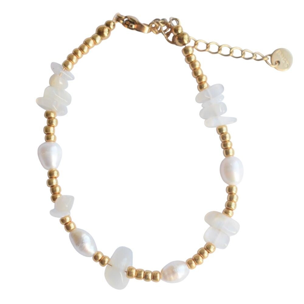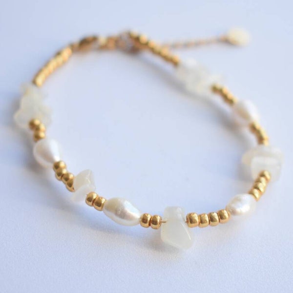 Shop deze stijlvolle armband maansteen met echte zoetwater parels en voel de girlpower! De vrouwelijke edelsteen maansteen gecombineerd met gouden stainless steel kralen en parels, maken deze armband betoverend!