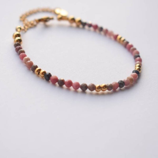 Shop nu deze roze armband met sprankelende rhodoniet edelsteentjes. Fijn te combineren met gouden armbandjes. Shiny roze en grijze tinten.