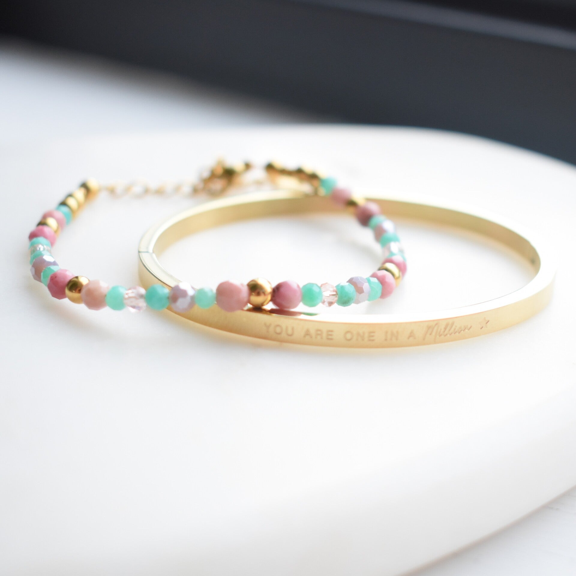 Shop nu deze edelstenen armband met sprankelende rhodoniet en zeeblauwe amazoniet edelsteentjes. Fijn te combineren met gouden armbandjes. Shiny roze en licht blauwe tinten. Love it!