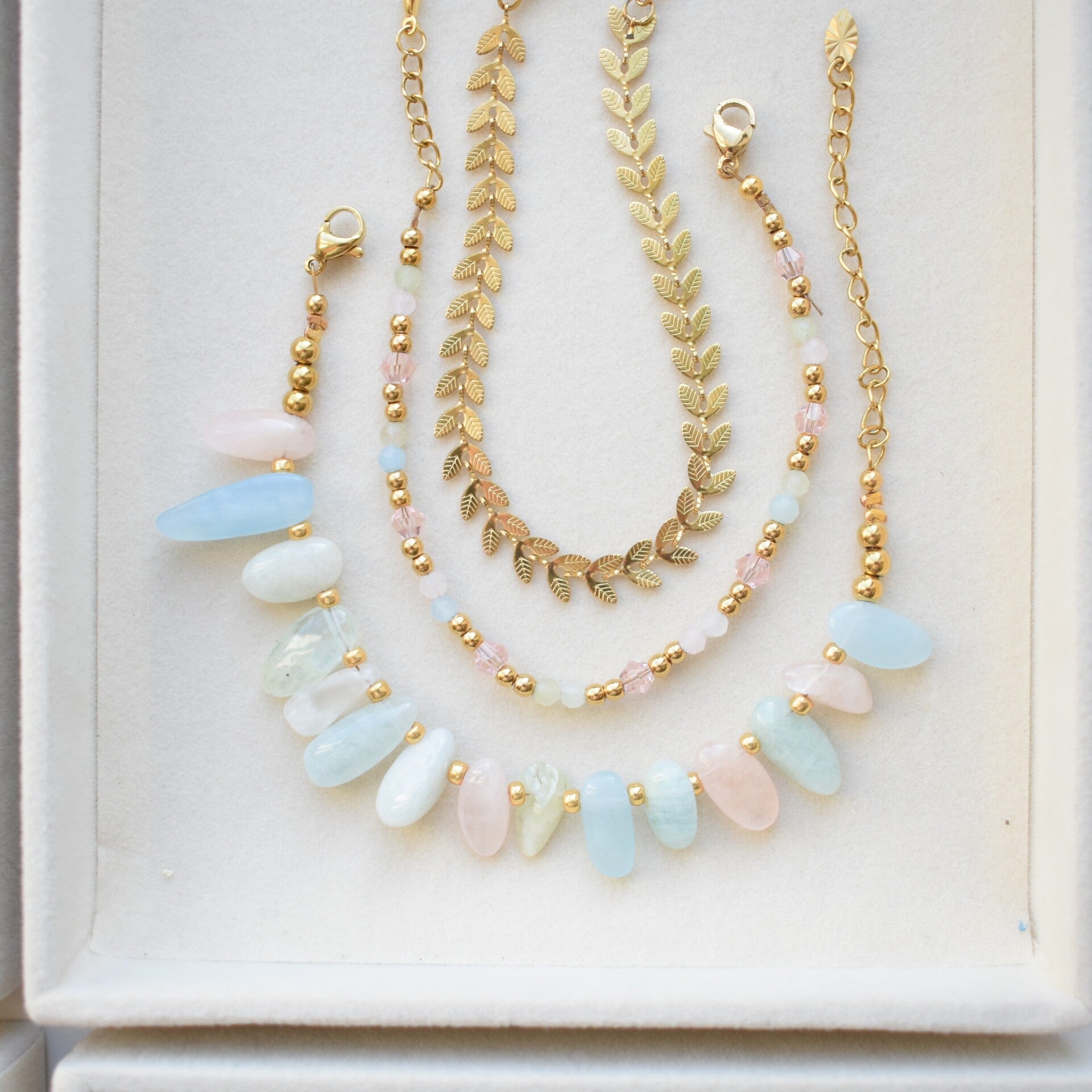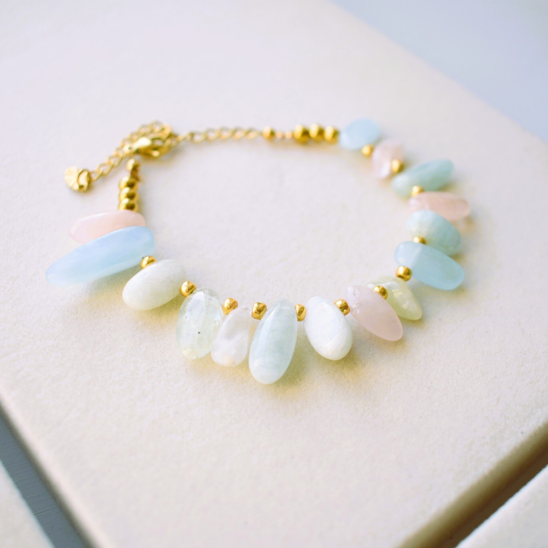 Deze prachtige edelsteen armband is handgemaakt van échte edelstenen morganiet en stainless steel kralen. De beeldige pastelkleurige morganiet in combinatie met goud laten je stralen in de lente! Love it.